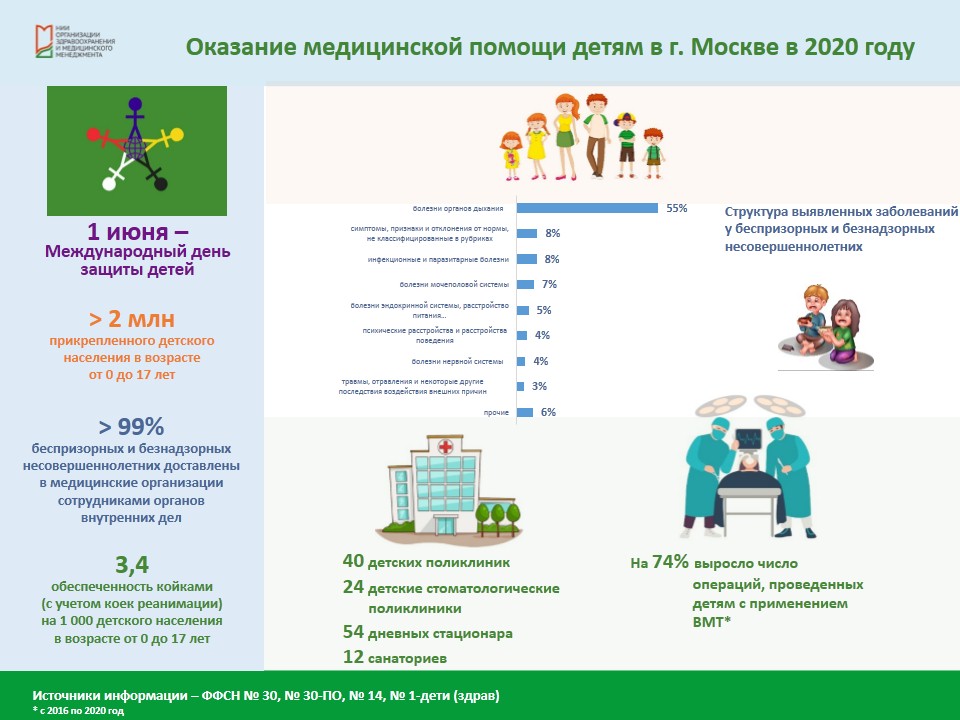 Численность обслуживаемого прикрепленного населения в возрасте от 0 до 17 лет в столичной сети, по данным Формы федерального статистического наблюдения № 30, составляет более 2 миллионов человек. Для оказания медицинской помощи детям в городе действуют 40 детских поликлиник, 24 детские стоматологические поликлиники, 54 отделения дневных стационаров на более чем 1,5 тысячи мест, 5 специализированных детских больниц. В 2020 году обеспеченность койками (с учетом коек реанимации) – 3,4 на 1 000 детей. Восстанавливать здоровье детям помогают 12 санаториев более чем на 1000 койко-мест.