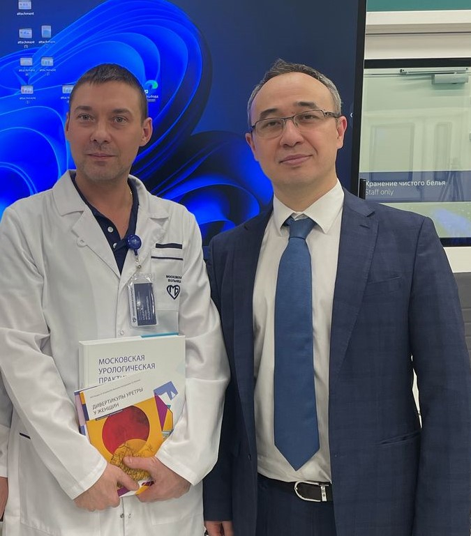 На фото: Ведущий специалист организационно-методического отдела по урологии ДЗМ Садченко А. В. с соискателем на присуждение ученой степени доктора медицинских наук Гуспановым Р. И. на апробации в МУЦ.