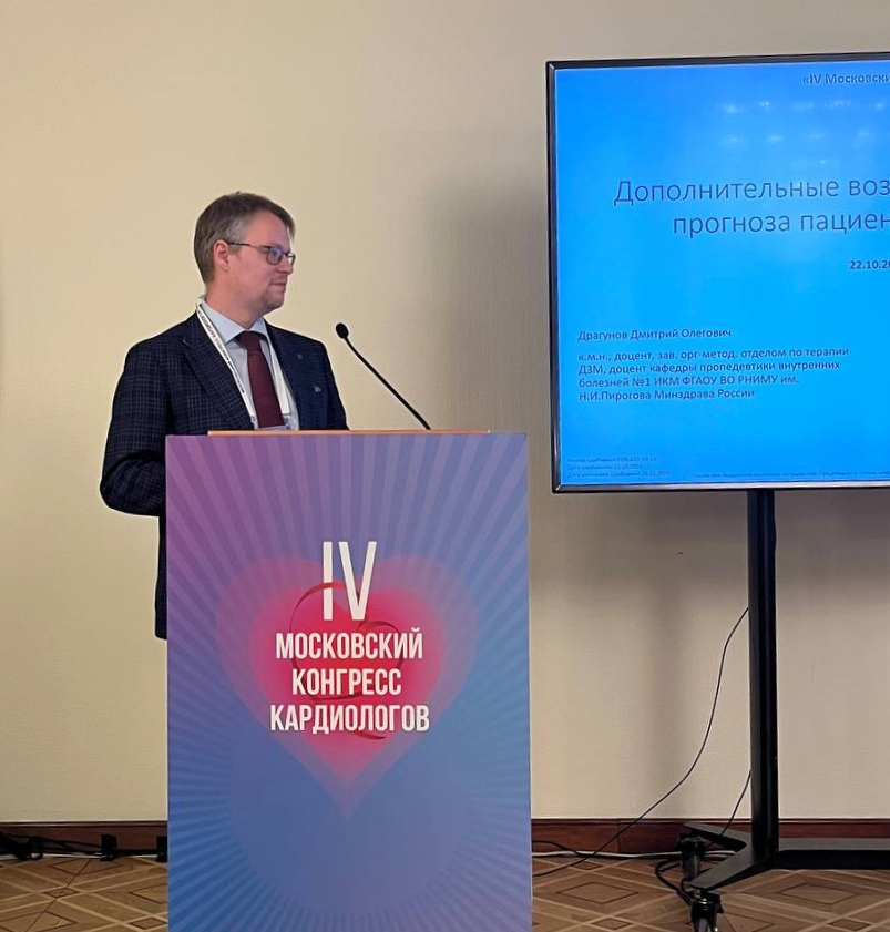 Заведующий организационно-методическим отделом по терапии, кандидат медицинских наук, доцент Дмитрий Олегович Драгунов выступил с докладом перед коллегами. В рамках доклада на тему «Дополнительные возможности для улучшения прогноза пациентов с хронической сердечной недостаточностью (ХСН) в Москве» были освещены современные подходы к ведению пациентов с ХСН, а также новые методы, направленные на повышение эффективности лечения и улучшение качества жизни больных.