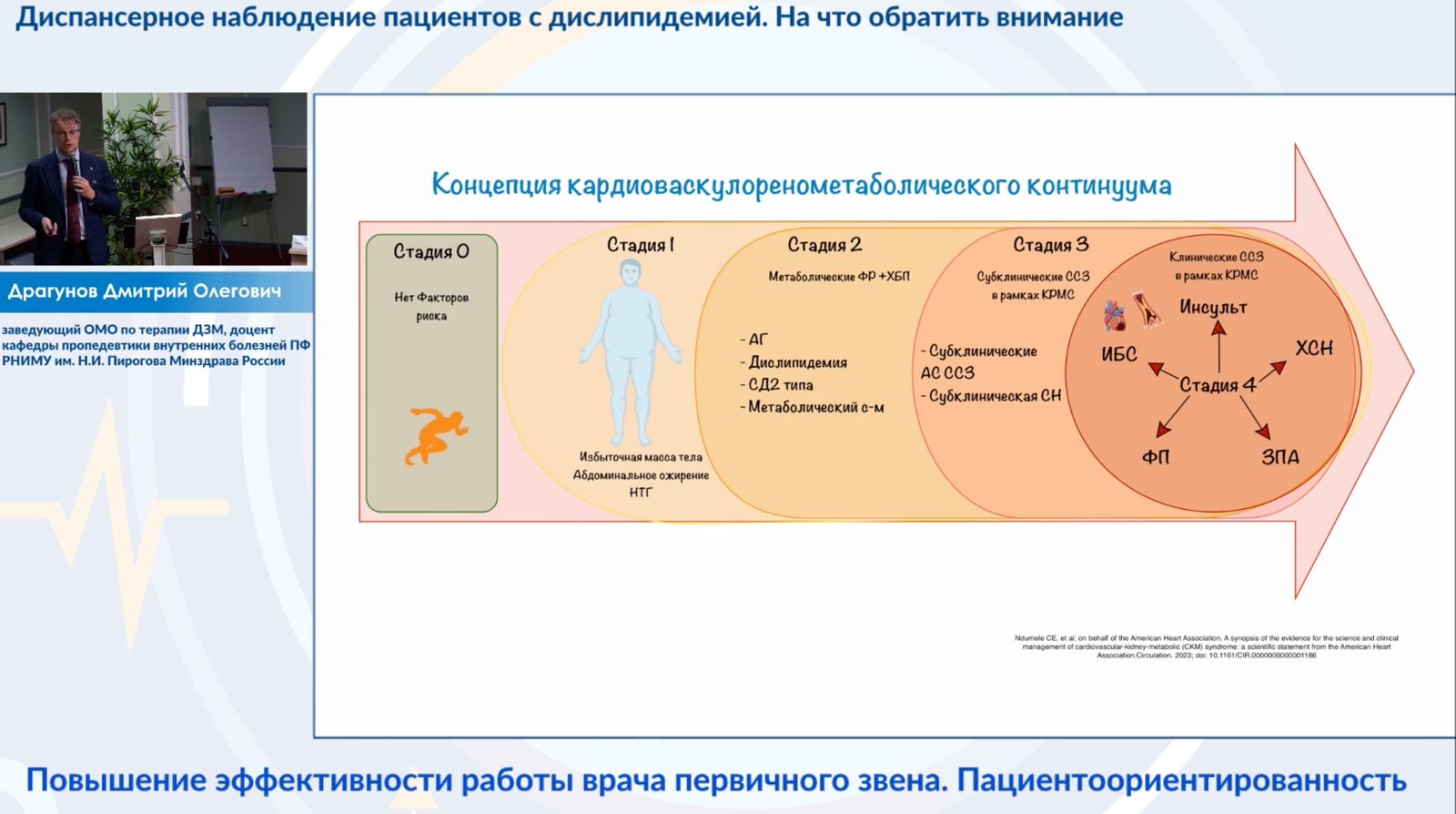 Дмитрий Драгунов, к. м. н., заведующий организационно-методическим отделом по терапии, доцент кафедры пропедевтики внутренних болезней РНИМУ им. Н. И. Пирогова, выступил с докладом на тему «Диспансерное наблюдение пациентов с дислипидемией. На что обратить внимание».
