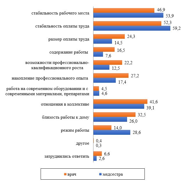 Для врачебного персонала оказалась относительно выше ценность факторов, влиявших в целом на удовлетворенность трудом, а именно содержание работы (в два раза важнее, чем для медицинских сестер), возможности профессионально-квалификационного роста (22,2 % против 12,5 % у медицинских сестер) и накопление опыта.