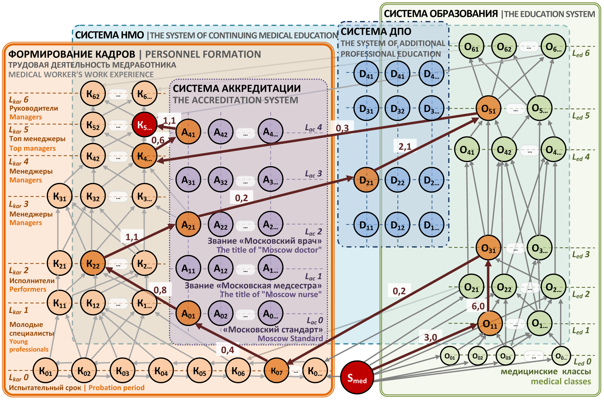 На рисунке представлен вариант среза в OLAP-кубе по запросу «топ-менеджеры», к которым в МО можно отнести заведующих отделениями/подразделениями, главных врачей, заместителей главного врача и т. п. Это позволяет проследить трудовую деятельность человека в динамике. Вес дуг по направлениям (на рисунке граф выделен жирными стрелками) характеризует время работы сотрудника (отработанные годы) для перехода на другой уровень (для получения образования, повышения квалификации, прохождения аккредитации, дополнительного обучения и т. п.). Данную иллюстрацию можно использовать при формировании кадровой политики МО, управлении персоналом и мотивации для повышения интеллектуального потенциала работников.