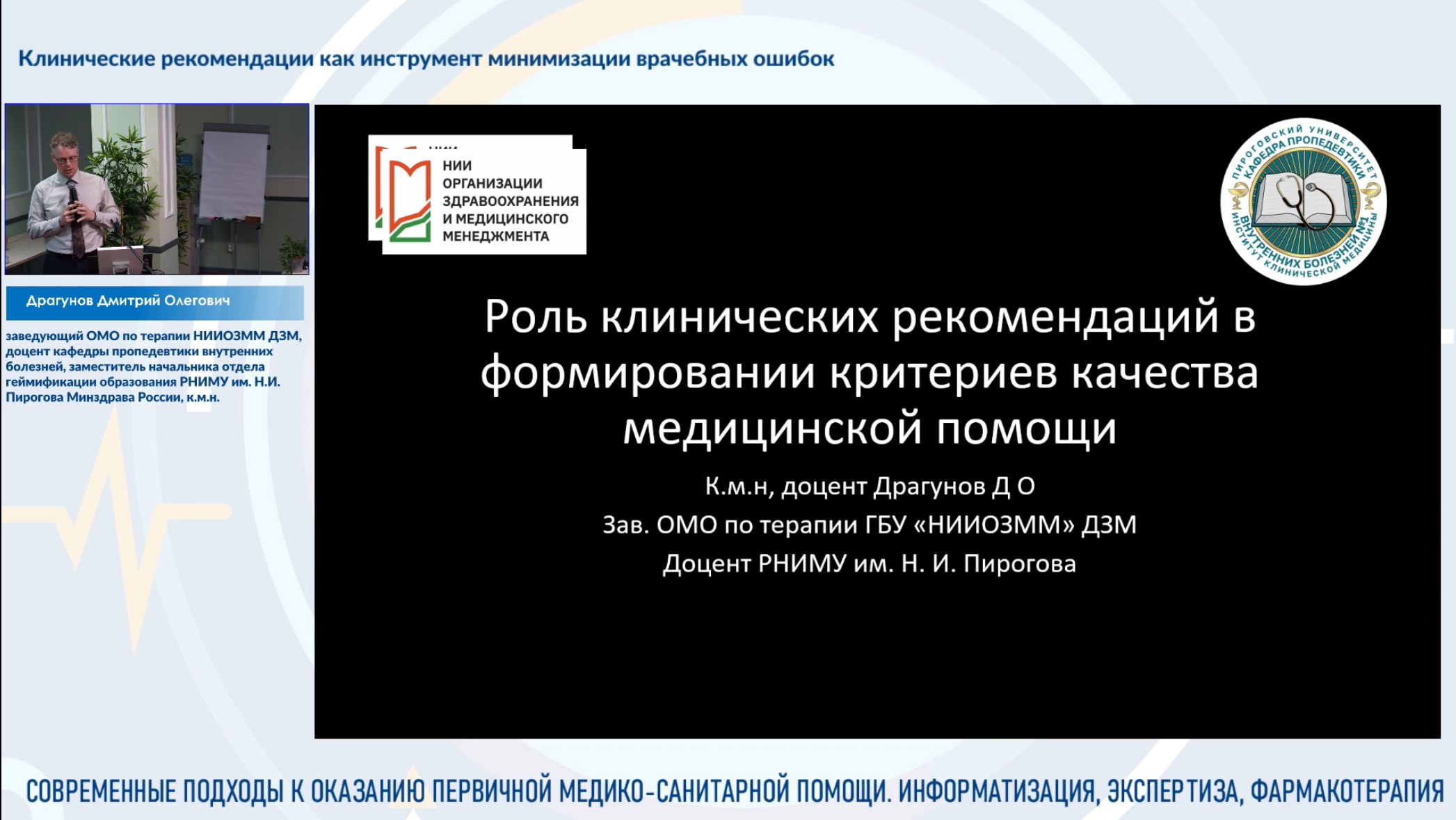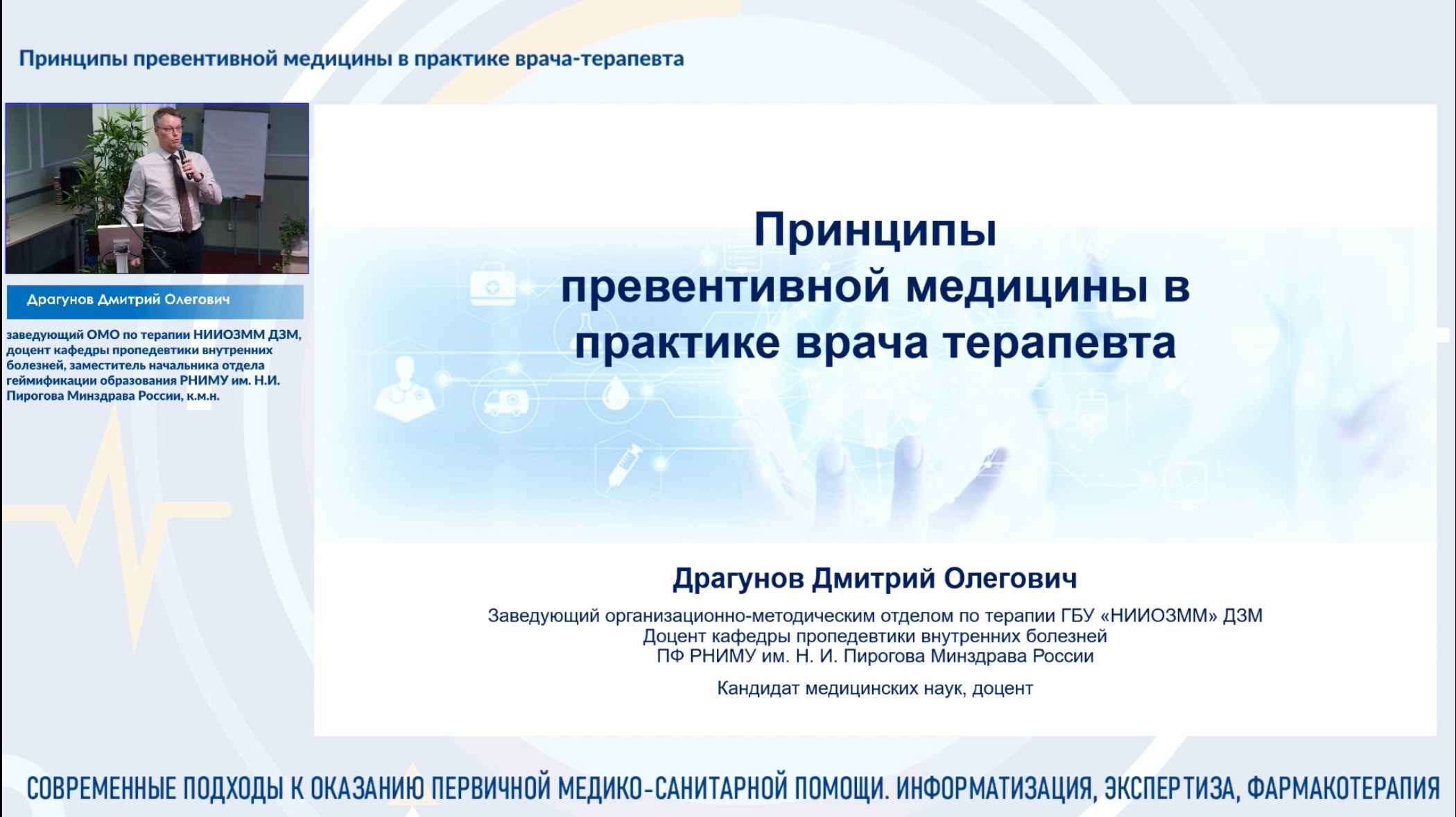 - Дмитрий Олегович Драгунов — заведующий организационно-методическим отделом по терапии Департамента здравоохранения города Москвы, доцент кафедры пропедевтики внутренних болезней № 1 ИКМ РНИМУ им. Н.И. Пирогова Минздрава России, к.м.н., доцент, с темой «Принципы превентивной медицины в практике врача-терапевта»;