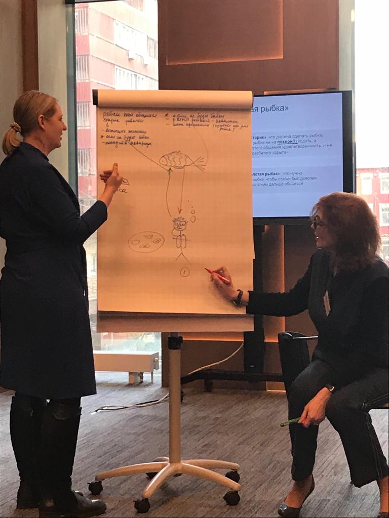 Активные обсуждения и практическая отработка навыков помогли легче усвоить полученные знания. К примеру, по мотивам произведения Александра Пушкина «Сказка о рыбаке и рыбке» в игровой форме участники разбирали, что можно дать пациенту и что хочет получить пациент? После игры «Холдинг хлопцев», где оценивалось качество хлопков ладошками, разбирались критерии эффективной обратной связи.