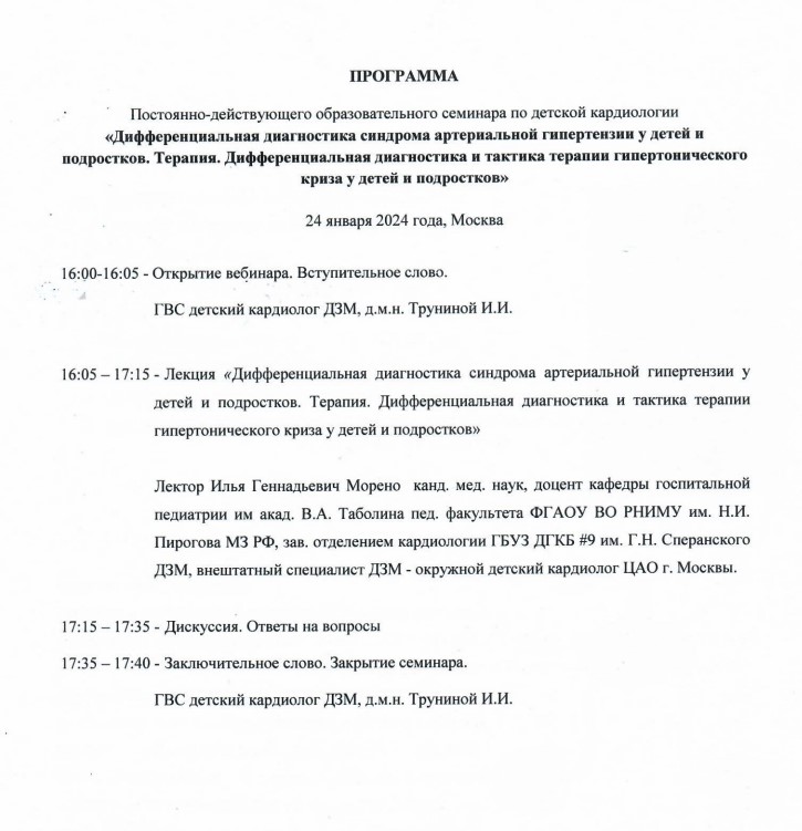 24 января 2024 года в 16:00 (МСК) на цифровой платформе «Московская медицина. Мероприятия» состоится семинар «Дифференциальная диагностика синдрома артериальной гипертензии у детей и подростков. Терапия. Дифференциальная диагностика и тактика терапии гипертонических кризов у детей и подростков».