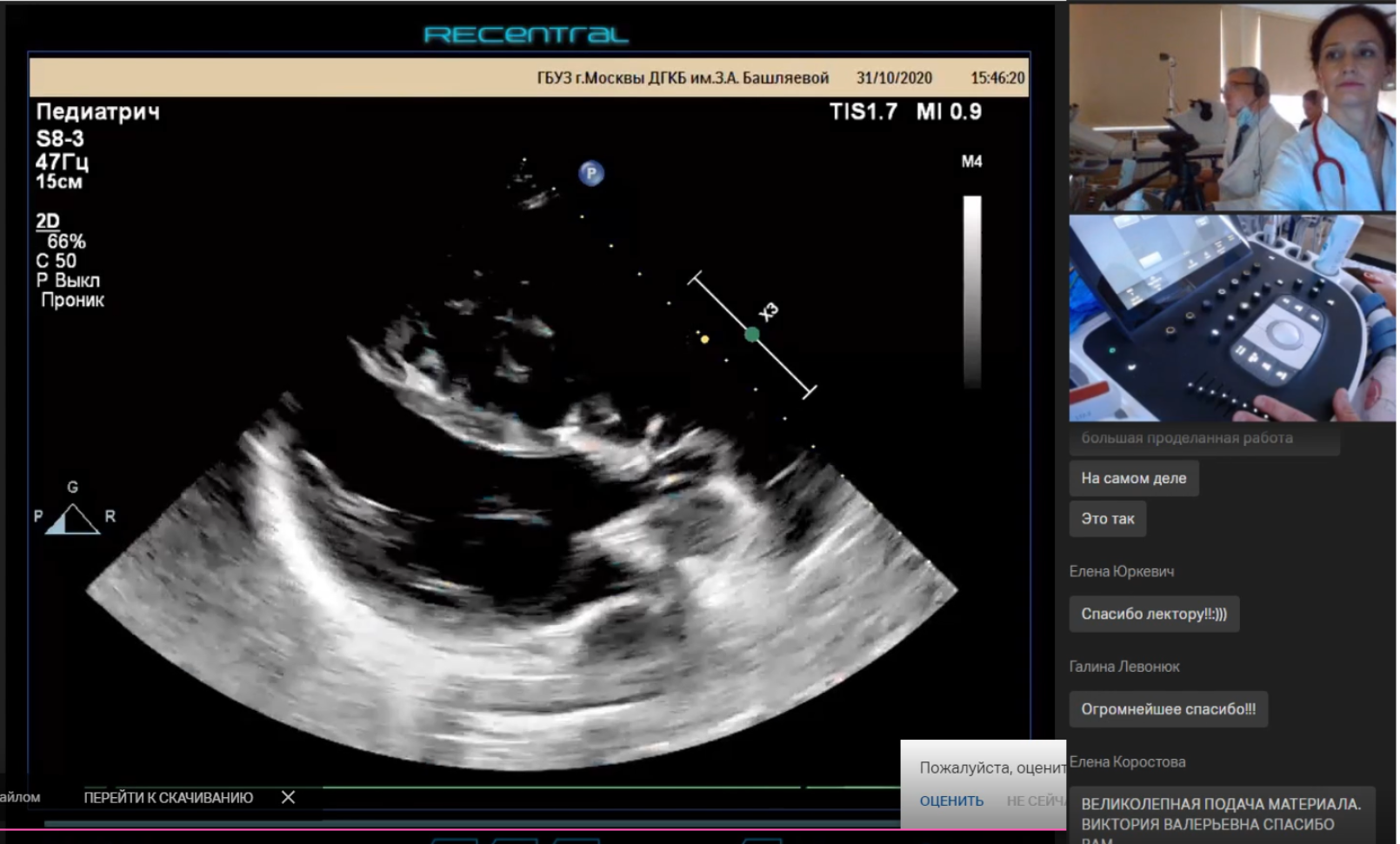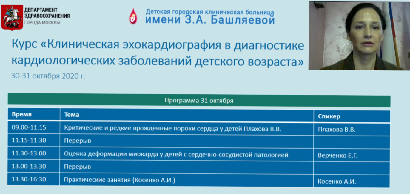 30–31 октября 2020 года по инициативе главного внештатного специалиста детского кардиолога ДЗМ Москвы, д. м. н. Труниной Инны Игоревны на базе ДГКБ им. З. А. Башляевой ДЗМ успешно прошел двухдневный курс «Клиническая эхокардиография в диагностике кардиологических заболеваний детского возраста». Сотрудники ОМО по педиатрии НИИОЗММ ДЗМ приняли активное участие в организации и проведении образовательного мероприятия.