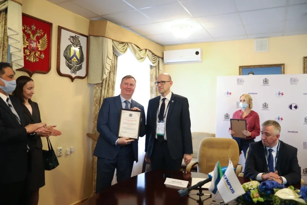Заместитель председателя правительства Хабаровского края Евгений Леонидович Никонов вручил руководителю ОМО по колопроктологии НИИОЗММ ДЗМ Татьяне Шкурко и ведущему специалисту Алексею Веселову благодарственные письма за поддержку и организационно-методическое сопровождение при внедрении и реализации скрининговых онкологических программ на территории Хабаровского края.