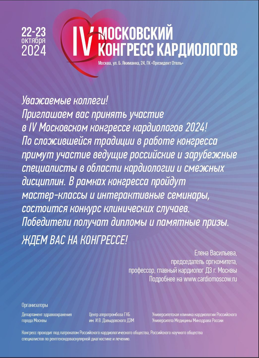 22–23 октября в Москве в ГК «Президент Отель» (ул. Б. Якиманка, д. 24) состоится IV Московский конгресс кардиологов 2024! Организационно-методический отдел по кардиологии приглашает коллег принять участие в конгрессе.