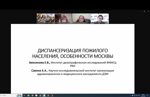 25 сентября 2024 г. на секции «Здоровье и самосохранительное поведение населения» сотрудниками Отдела демографии НИИ организации здравоохранения и медицинского менеджмента были представлены доклады: ведущим научным сотрудником Савиной А. А., к. м. н., и ведущим специалистом Земляновой Е. В., к. э. н., по теме «Диспансеризация пожилого населения, особенности Москвы», научным сотрудником Семеновой В. Г., д. э. н., и начальником Организационно-аналитического управления Департамента здравоохранения г. Москвы Григоровым А. А., к. м. н., на тему «Россия на пути к кардиологической революции: ракурс Москвы».