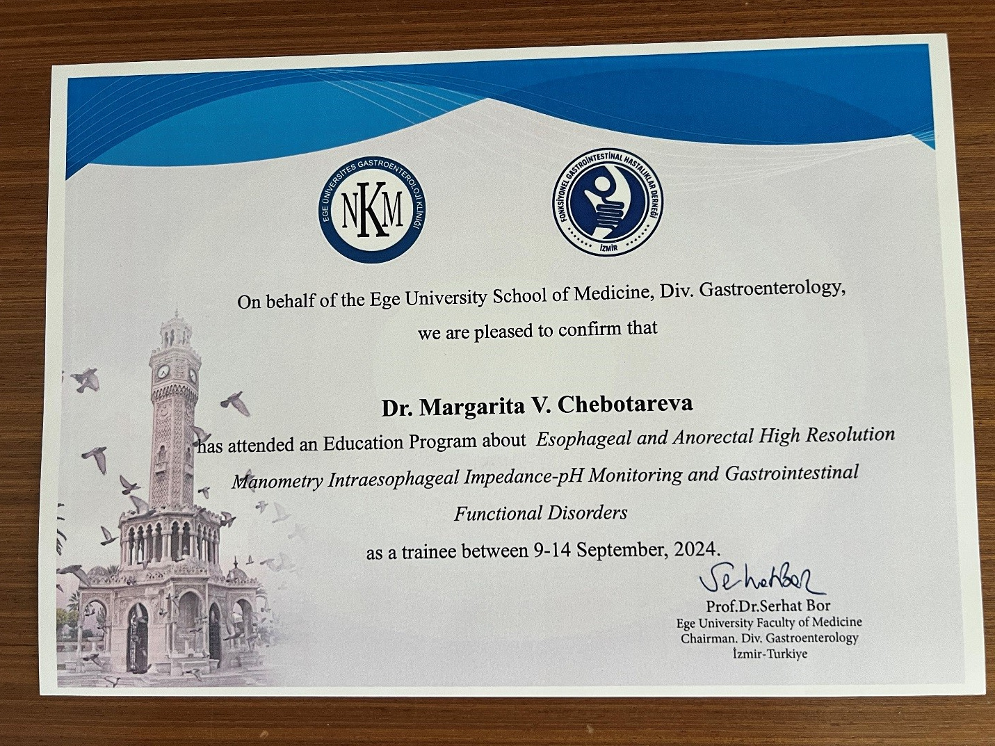 9–14 сентября 2024 года специалист организационно-методического отдела Маргарита Чеботарева прошла обучение в рамках программы «Пищеводная и аноректальная манометрия высокого разрешения, внутрипищеводная импеданс рН-мониторинг и желудочно-кишечные функциональные заболевания» на базе гастроэнтерологического отделения больницы при медицинском факультете Эгейского университета (Измир, Турция) и получила именной сертификат.
