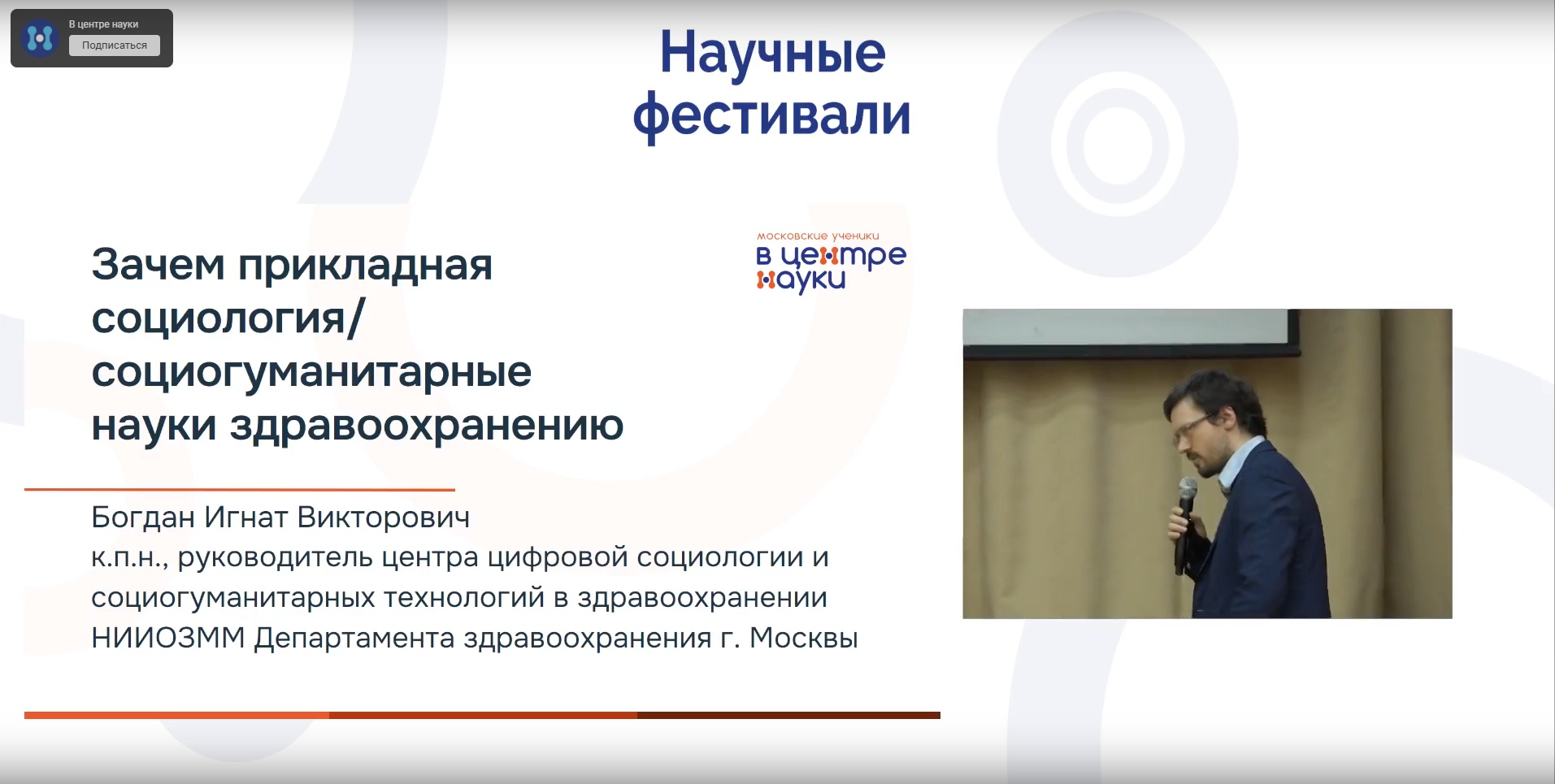 Руководитель Центра цифровой социологии и социогуманитарных технологий в здравоохранении НИИ организации здравоохранения и медицинского менеджмента Игнат Богдан принял участие в качестве лектора в просветительском московском проекте «В центре науки» в рамках Научного фестиваля по социально-гуманитарным наукам в школе № 1590 имени Героя Советского Союза В. В. Колесника.