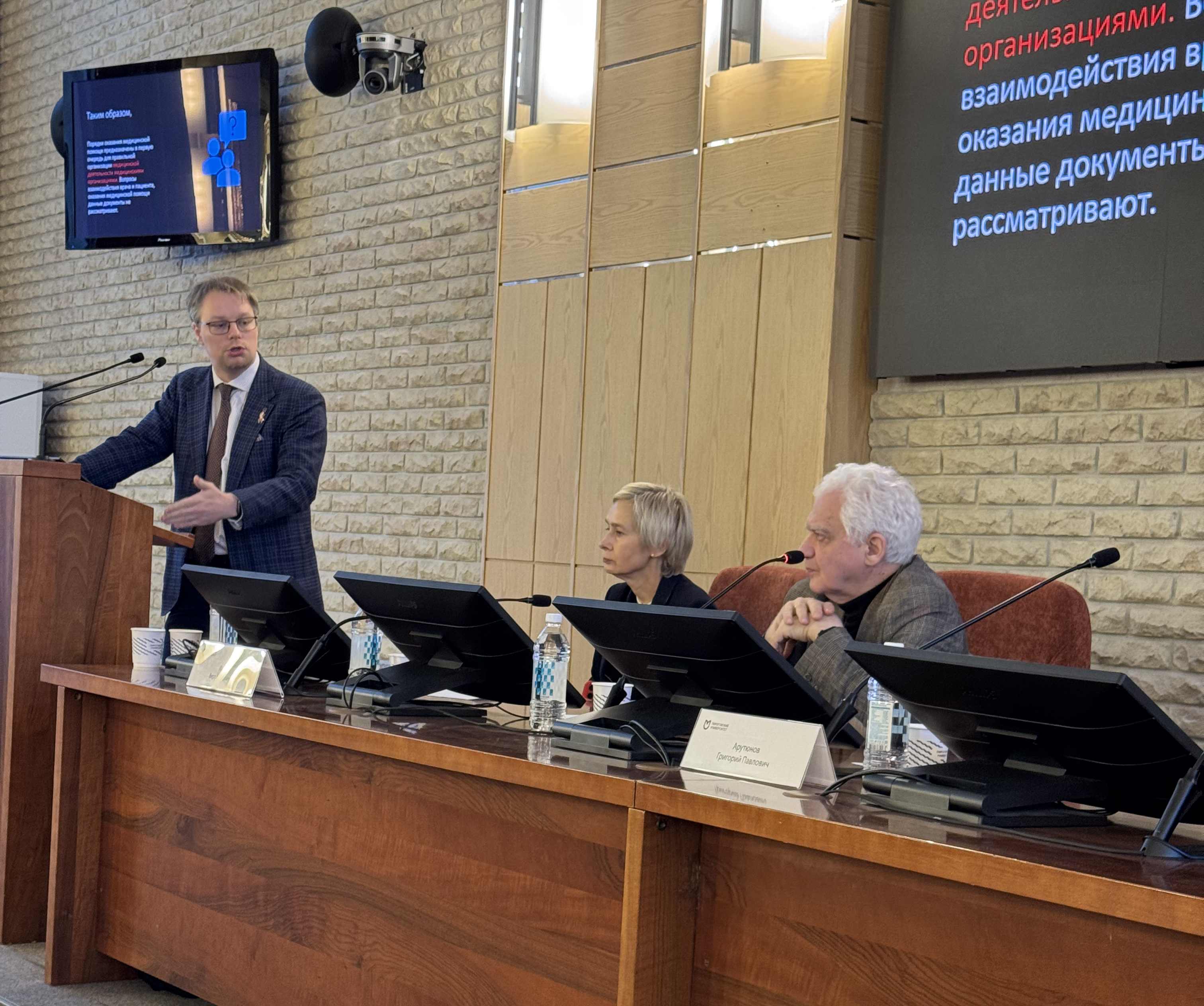 - Евгений Олегович Таратухин, к.м.н., заведующий кафедрой медицинского права, этики и антропологии, представил сообщение на тему «Правовая компетенция выпускника медицинского вуза как междисциплинарное знание».