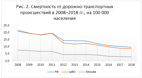 Аналогично отличается и уровень смертности по причине дорожно-транспортных происшествий в Москве от среднероссийского показателя: в 2008 г. – 21,0 в РФ и 7,7 в Москве; в 2018 г. – 9,7 в РФ и 2,9 в Москве. За данный период смертность по причине ДТП сократилась в 2,2 раза по РФ, и в 2,7 раз по Москве. Темпы снижения смертности от дорожно-транспортных происшествий по РФ и по ЦФО близки (рис. 2).