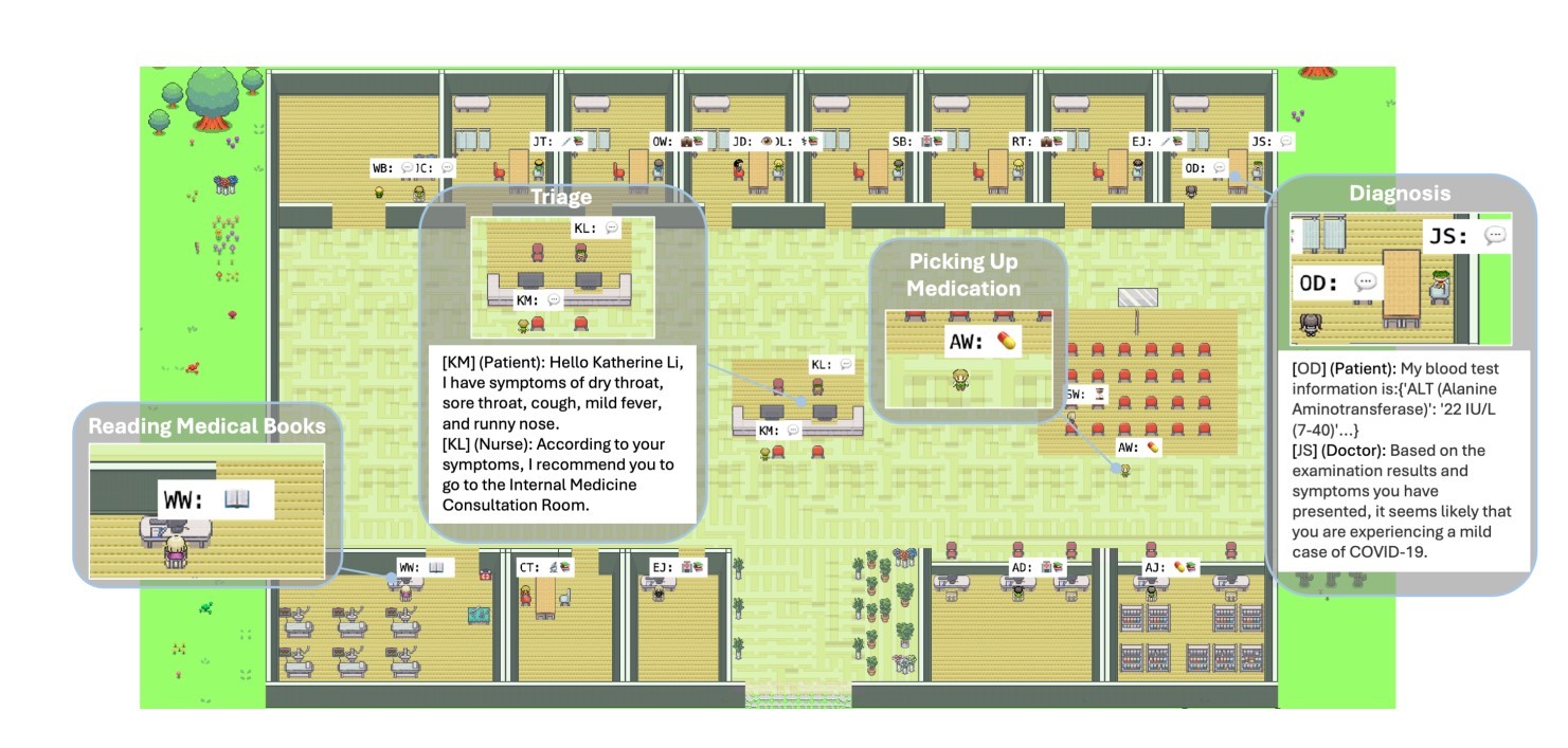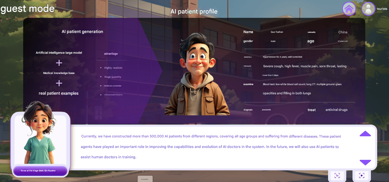 По словам исследователей, концепция виртуальной больницы Agent Hospital отличается автономностью работы и способностью к саморазвитию, не имеет аналогов в мире. Система воспроизводит больничную структуру и все рабочие процессы, составляющие путь пациента: поступление, триаж, консультацию, осмотр, диагностику, лечение, реабилитацию и мониторинг. Внутри симуляции действуют цифровые персонажи – пациенты, врачи и медсестры, сгенерированные с помощью большой языковой модели ChatGPT.