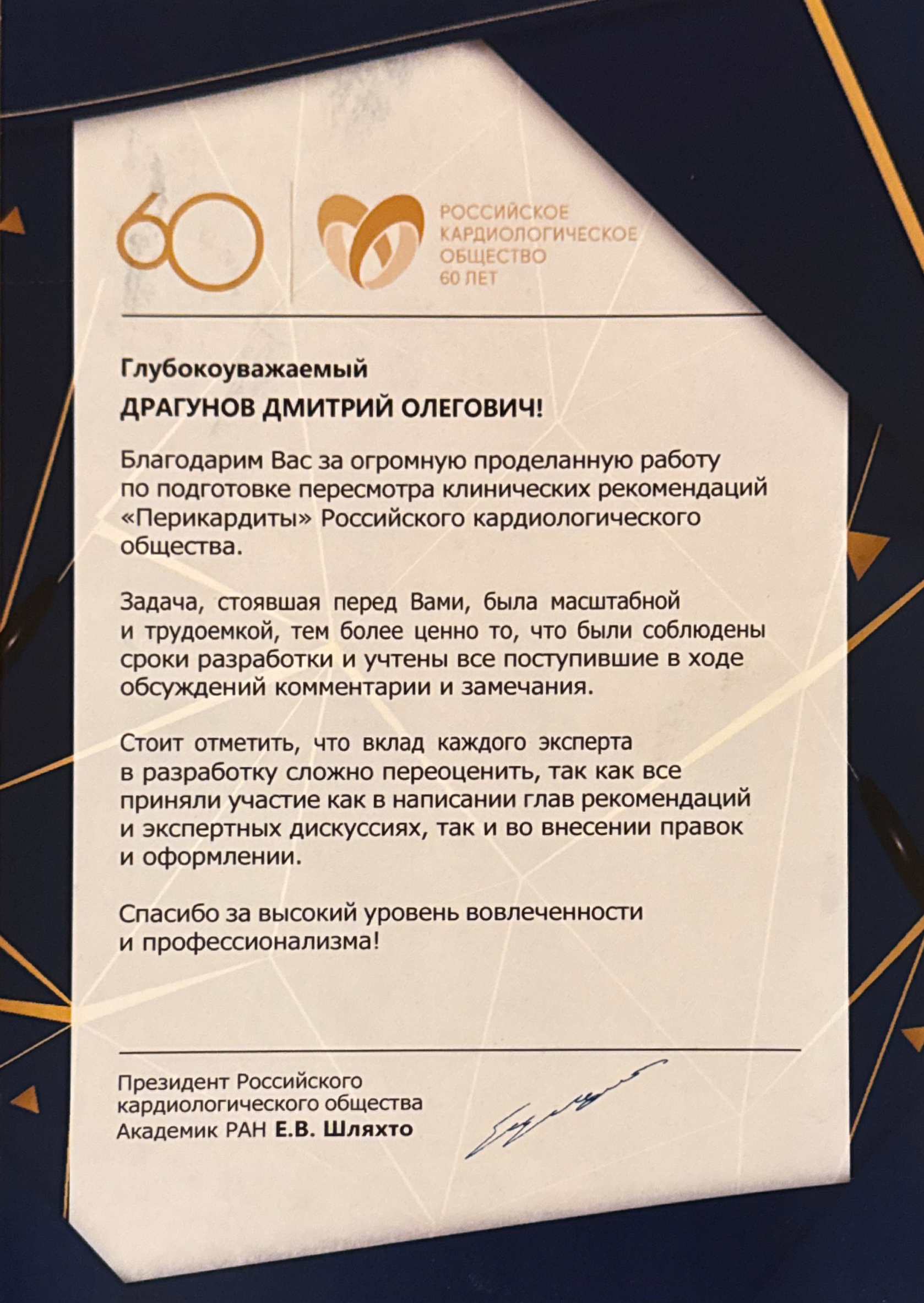 Заведующий организационно-методическим отделом по терапии Дмитрий Драгунов получил благодарность от Российского кардиологического общества за участие в разработке клинических рекомендаций по перикардитам. В благодарности отмечены его вклад в создание и пересмотр важного для специалистов документа. Президент Российского кардиологического общества академик РАН Евгений Шляхто выразил признательность за профессионализм и ответственность.