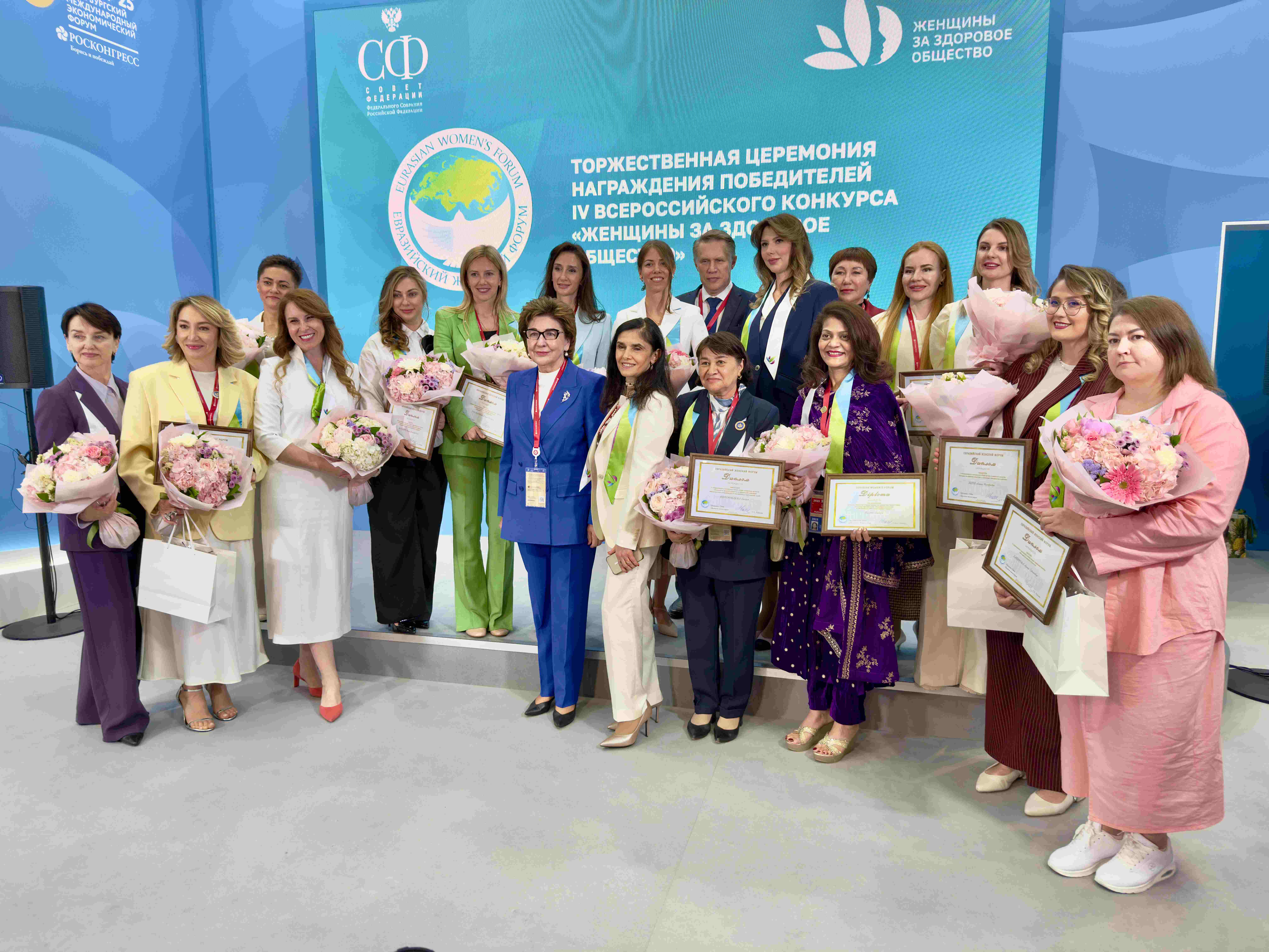 Форум продолжился церемонией награждения победителей IV конкурсного отбора «Женщины за здоровое общество», проводимого при поддержке Совета Евразийского женского форума, Министерства здравоохранения Российской Федерации, Фонда Росконгресс, а также интеллектуального партнера НИИ организации здравоохранения и медицинского менеджмента.