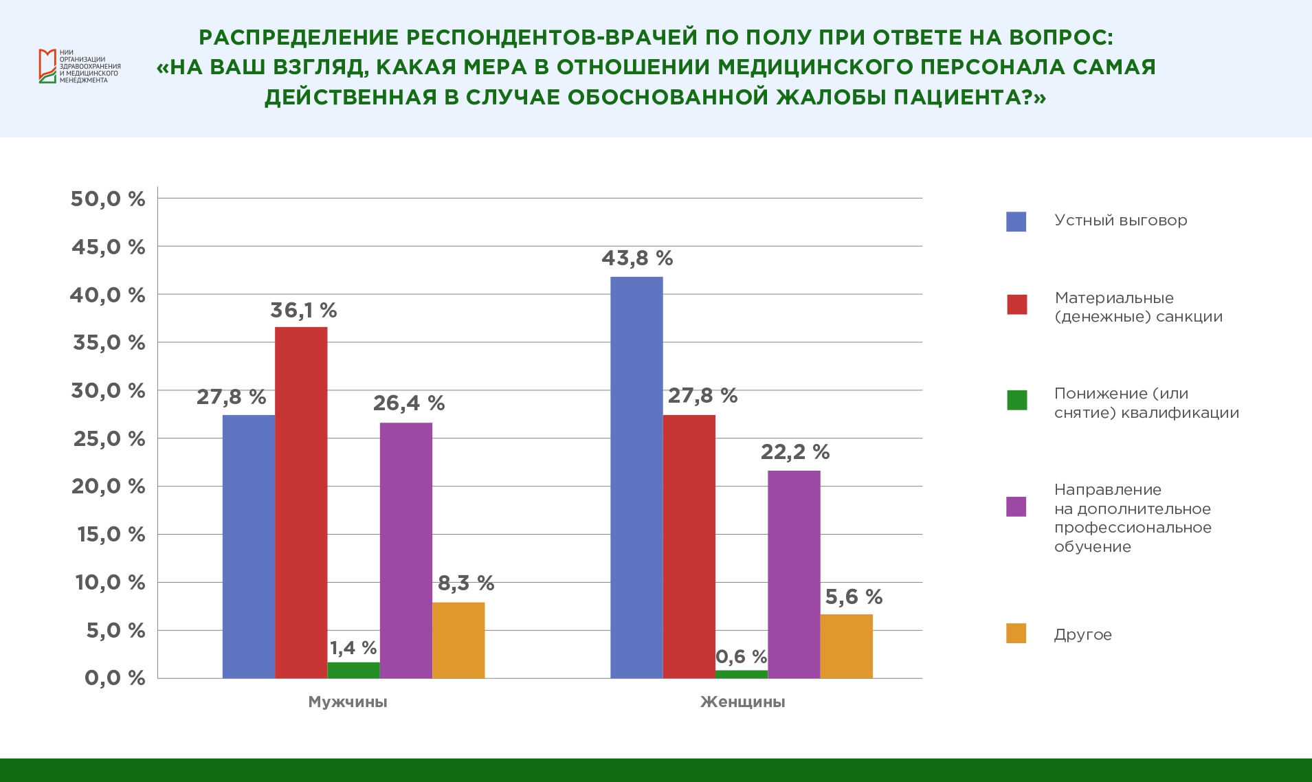 При принятии решения о необходимой мере наказания в отношении врача руководитель должен иметь в виду, что почти каждая вторая женщина-врач считает, что при обоснованной жалобе пациента справедливым будет только устный выговор медицинскому сотруднику, 27,8 % женщин полагают, что нужно применять материальные санкции. Мужчины-врачи гораздо чаще считают, что медицинский персонал необходимо наказывать «рублем» (каждый третий респондент мужского пола отметил вариант «материальные санкции»), 27,8 % полагают правильным сделать устный выговор. За направление на дополнительное профессиональное обучение выступают 26,4 % врачей-мужчин и 22,2 % врачей-женщин, применение радикальных мер, таких как понижение или снятие квалификации, считают верным только 1,4 % мужчин и 0,6 % женщин.